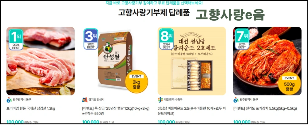 공식 사이트인 고향사랑e음에서는 지역별 답례품 리스트가 정리되어 있고, 연말정산 영수증이 자동 생성되어 매우 편리합니다.
